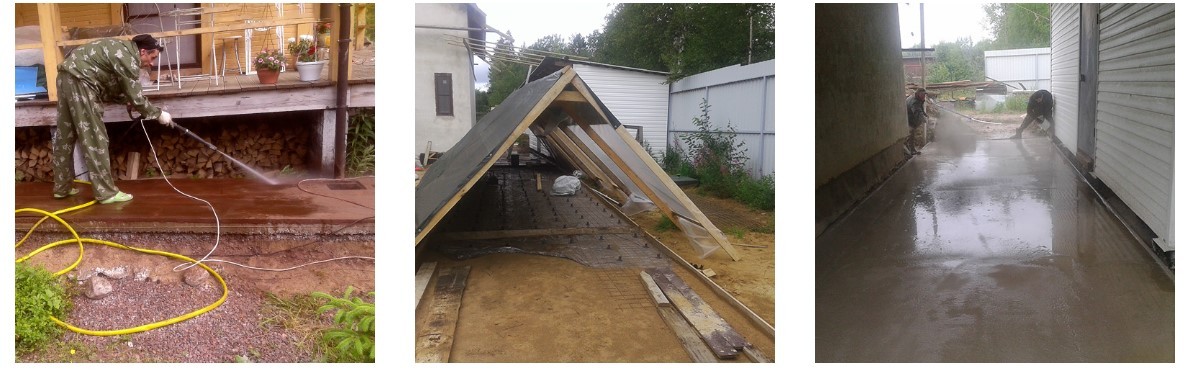 После этого поверхность бетона чистят, убирают излишек материала жесткими щетками с длинным ворсом. Поверхность промывают и просушивают.