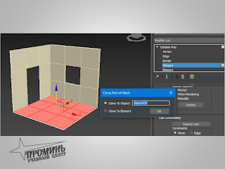 Рис.5. Копируем полигоны от стены и пола с параметром Clone To Object c зажатой кнопкой Shift и потянув стрелочку пивота.