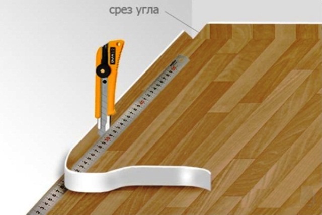 Последний вид ножей отлично подходит для нашего случая, хотя, можно выбрать и приспособления для резки любых напольных покрытий. Бытовыми ножами сделать все аккуратно и правильно не получится – срез будет неровным и некрасивым. Правильно разложив материал и выбрав подходящий нож остается лишь понять, как обрезать линолеум по стене.