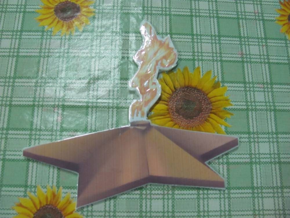Еще для изготовления стенда нам понадобится Вечный огонь. В нашем случае вырезана картинка, приклеена с помощью клея карандаша и заламинирована скотчем. Вырезаем канцелярским ножом, отступая от края картинки пару мм.