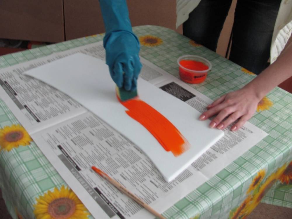 - теперь обклеиваем клейкой цветной пленкой детали плитки или покрываем акриловой краской с помощью губки.