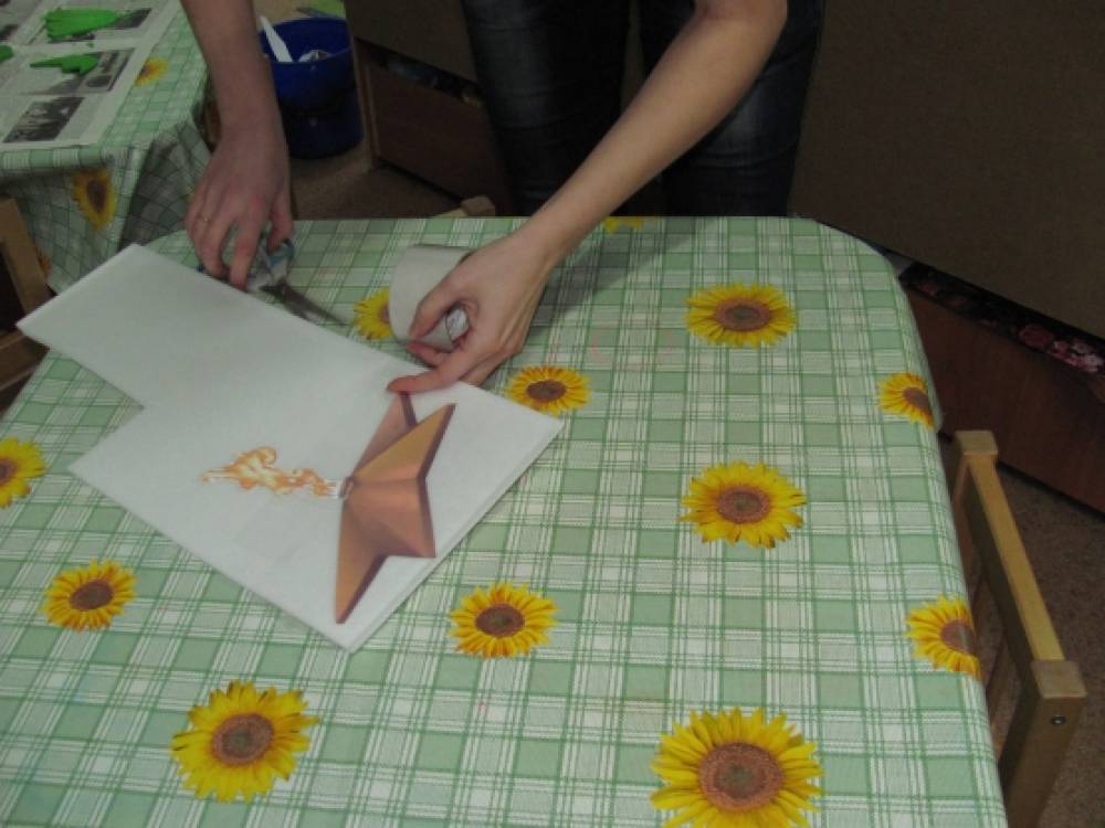 Еще для изготовления стенда нам понадобится Вечный огонь. В нашем случае вырезана картинка, приклеена с помощью клея карандаша и заламинирована скотчем. Вырезаем канцелярским ножом, отступая от края картинки пару мм.